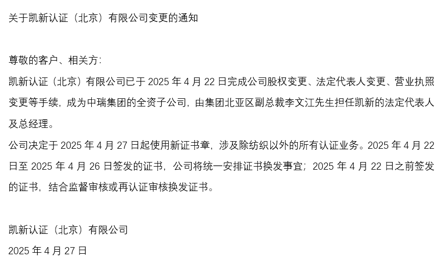2025.09.05綠色賦能,智鏈全球——?jiǎng)P新認(rèn)證亮相2025 Intertextile秋冬展,共繪紡織可持續(xù)新圖景2025年9月2至4日,中國(guó)國(guó)際紡織面料及輔料(秋冬)博覽會(huì)(以下簡(jiǎn)稱:2025 Intertextile秋冬面輔料展)在國(guó)家會(huì)展中心(上海)成功舉辦。2025.09.02凱新認(rèn)證紡織認(rèn)證部赴Cotecna集團(tuán)北亞區(qū)&中國(guó)區(qū)總部參加培訓(xùn),專業(yè)能力再上新臺(tái)階近日,我司紡織認(rèn)證部審核員團(tuán)隊(duì)赴Cotecna集團(tuán)北亞區(qū)&中國(guó)區(qū)總部參加了由資深專家張偉龍主講的培訓(xùn)。此次培訓(xùn)圍繞環(huán)境管理體系等相關(guān)標(biāo)準(zhǔn)、審核要點(diǎn)及行業(yè)實(shí)踐展開(kāi),通過(guò)理論講解、案例分析和互動(dòng)研討,進(jìn)一步提升了團(tuán)隊(duì)的專業(yè)技術(shù)能力和服務(wù)水平。2025.07.02凱新認(rèn)證(北京)有限公司順利通過(guò)ANAB FSSC 22000食品安全體系現(xiàn)場(chǎng)見(jiàn)證評(píng)審凱新認(rèn)證(北京)有限公司(以下簡(jiǎn)稱“凱新認(rèn)證”)成功通過(guò)美國(guó)國(guó)家認(rèn)可委員會(huì)(ANAB)對(duì)FSSC 22000食品安全管理體系的現(xiàn)場(chǎng)見(jiàn)證評(píng)審,并以零不符合的卓越表現(xiàn),彰顯其行業(yè)實(shí)力與專業(yè)水準(zhǔn)。2025.04.27關(guān)于凱新認(rèn)證(北京)有限公司變更的通知尊敬的客戶、相關(guān)方: 凱新認(rèn)證(北京)有限公司已于2025年4月22日完成公司股權(quán)變更、法定代表人變更、營(yíng)業(yè)執(zhí)照變更等手續(xù),成為中瑞集團(tuán)的全資子公司,由集團(tuán)北亞區(qū)副總裁李文江先生擔(dān)任凱新的法定代表人及總經(jīng)理。